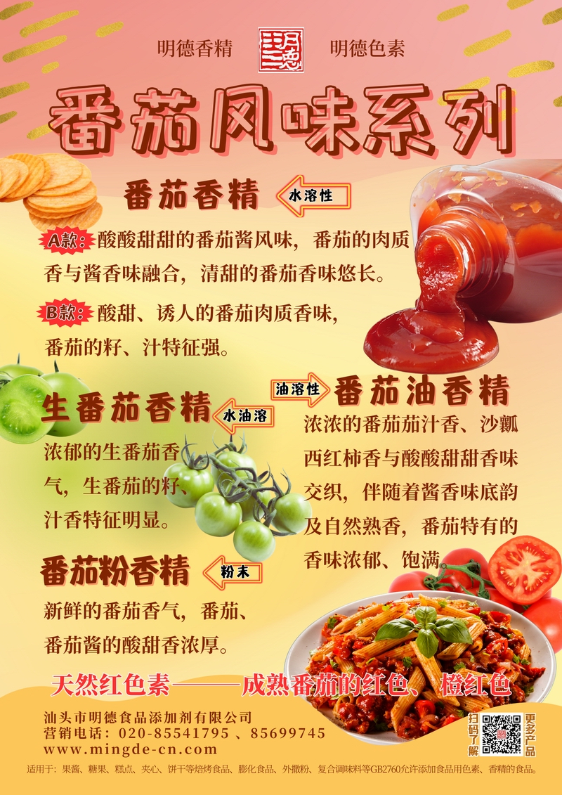 明德番茄風(fēng)味系列香精 酸甜鮮爽 覆蓋多樣應(yīng)用場景汕頭市明德食品添加劑有限公司推出的番茄風(fēng)味系列香精,覆蓋水溶性、油溶性與粉末香精,兼顧番茄醬、鮮番茄與成熟番茄等多種風(fēng)味調(diào)性。產(chǎn)品真實(shí)穩(wěn)定,適用于飲料、醬料、烘焙、休閑等多種B端場景。